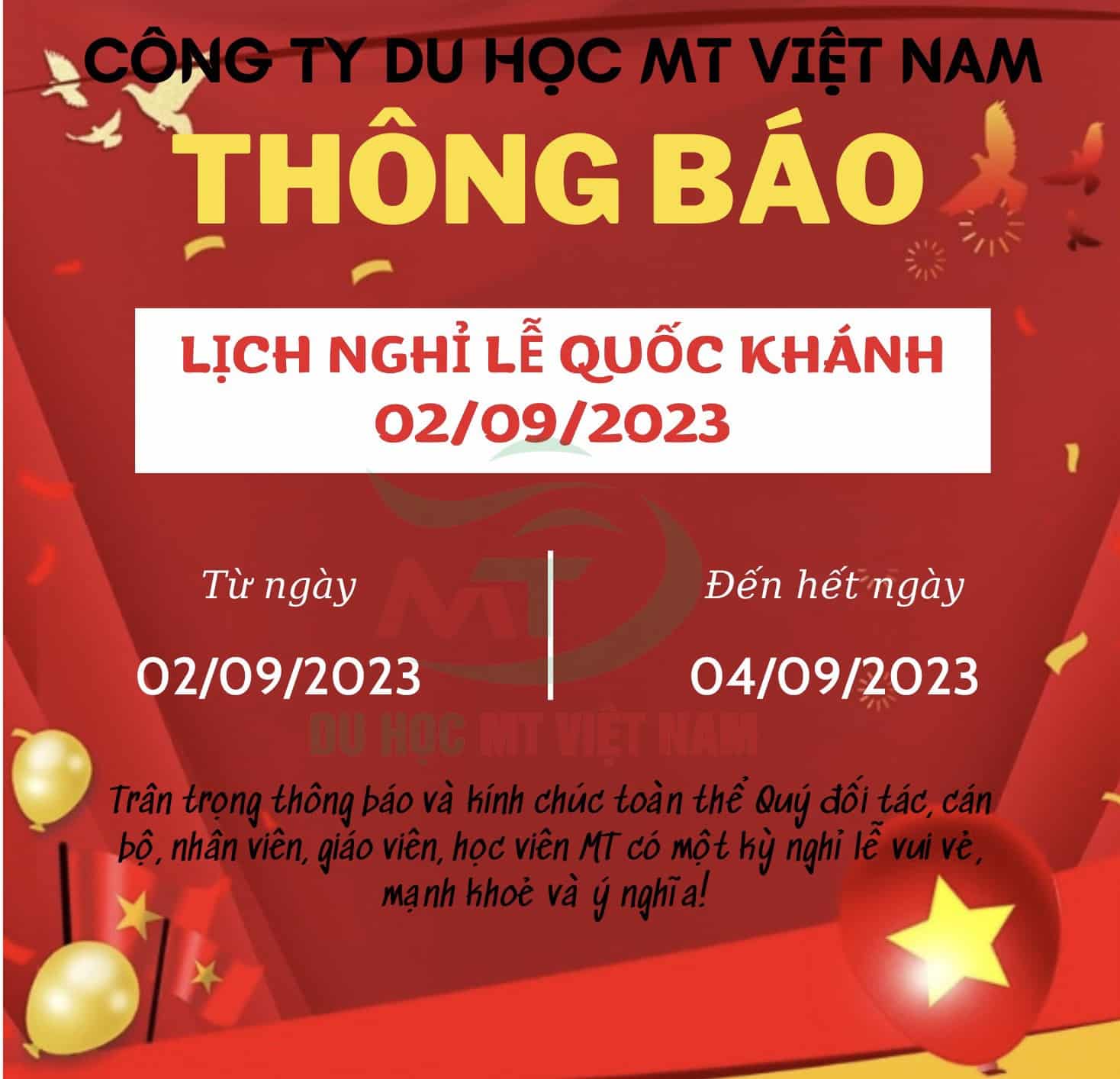 THÔNG BÁO NGHỈ LỄ QUỐC KHÁNH 02/09/2023 Nhân dịp nghỉ lễ các Chi nhánh MT...